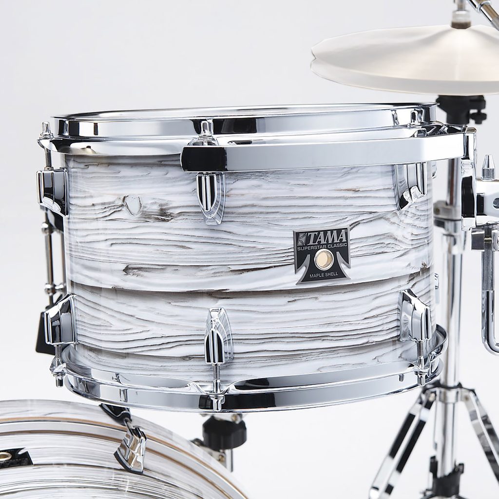 Bicí souprava Tama z řady Superstar Classic. Bubny Tama Superstar jsou už více než čtyřicet let symbolem průlomového designu, vysoké kvality zpracování a přesvědčivého zvuku. Na tuto tradici nyní plynule navazuje řada Superstar Classic, udržující vysoký standard kvality a zvuku, ale s dostupnější cenou. Korpusy bubnů jsou vyrobeny ze 6 vrstev javoru o celkové síle 5 mm, basový buben je pak z 8 vrstev o síle 7 mm. Povrchová úprava fólie se vzorem bílého jasanu (Ice Ash). Hardware a ráfky jsou chromované.