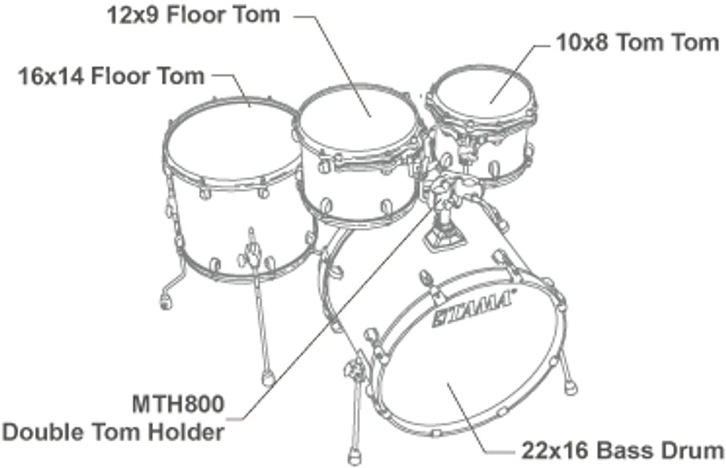 – basový buben: 22" × 16"