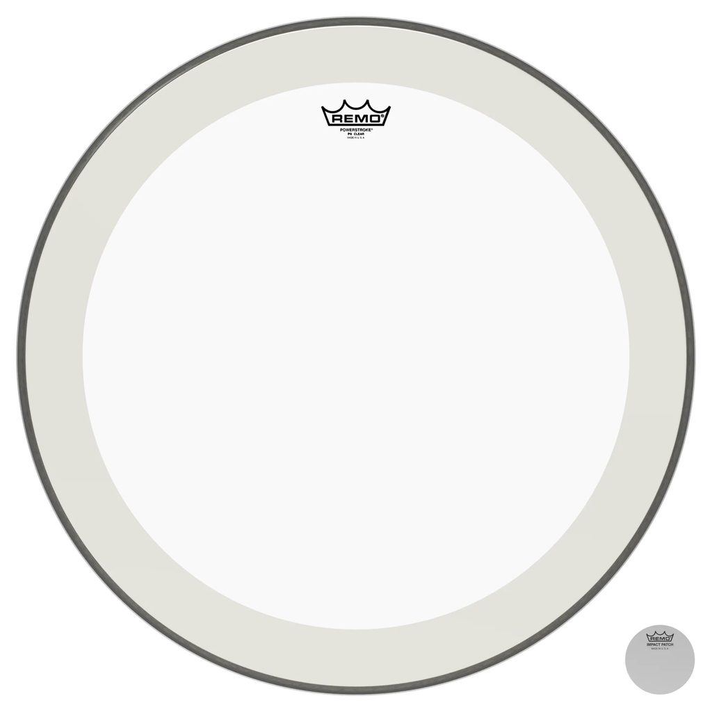Blána z řady Remo Powerstroke 4 na basový buben, průhledná. Blána je průhledná + zpevňovací úderový terč o síle 3 mil. Powerstroke 4 je dvouvrstvá verze (obě vrstvy jsou z fólie o síle 7 mil.) blány Powerstroke 3, a je proto trvanlivější a má konkrétnější, temnější středový zvuk. Ideální pro náročné hraní nebo tam, kde je požadován minimální sustain basového bubnu.