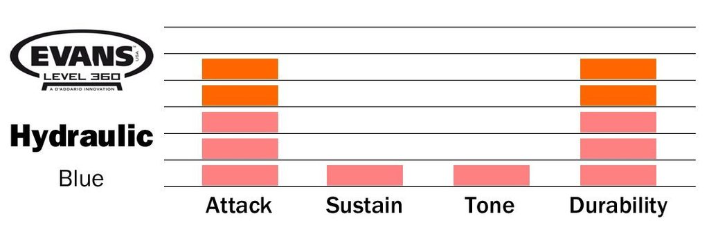 Úderová dvouvrstvá olejová blána na tom z řady Evans Hydraulic. Blána má tučný, krátký tón, který je typický pro sedmdesátá léta. Potažená je dvěma vrstvami filmu a známá je i díky extrémně lehkému ladění. Má krátký sustain, který dodává každému bubnu solidní zvuk. Ideální řešení pro místnosti s nekvalitní akustikou a množstvím odrazů. Efektní modrá barva. Průměr blány 10"/25,4 cm.