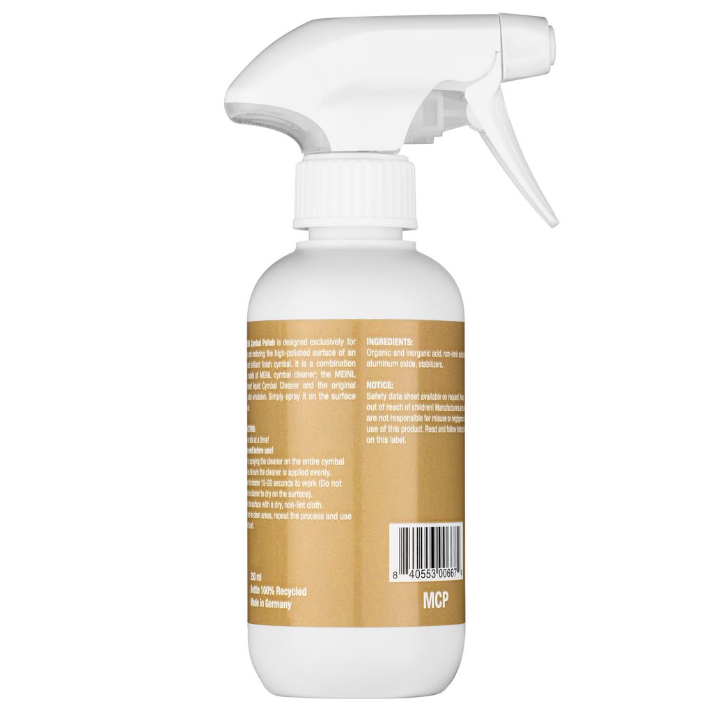 Prostředek na činely od firmy MEINL určený k údržbě činelů s lesklým povrchem. Jedná se o kombinaci dvou typů čisticích prostředků na činely: koncentrovaného tekutého čisticího prostředku Meinl Cymbal Cleaner a originální lešticí emulze Meinl. Prostředek je dodáván v lahvičce s pumpičkou pro snadnou aplikaci, která je jednoduchá: postříkejte povrch činelu a setřete hadříkem. Žádné zdlouhavé leštění. Aplikace prostředku neovlivňuje zvuk činelu.