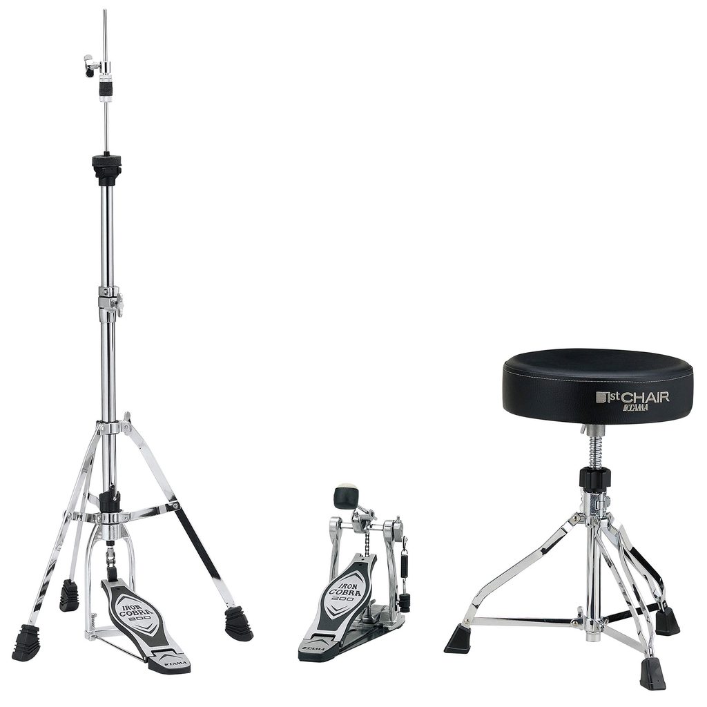 Základní hardwarová sada Tama. Obsahuje hardware Iron Cobra řady 200 a bubenickou židličku z řady 1st Chair.