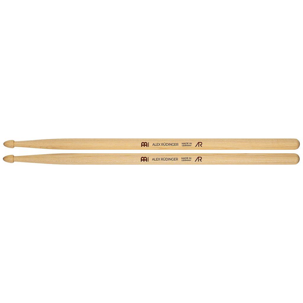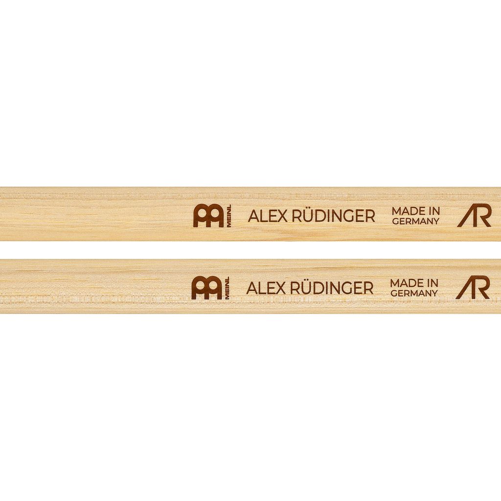 Podpisové hikorové paličky Meinl, Alex Rüdinger Signature. Tyto signature paličky vycházejí z paliček Meinl Heavy 2B, ale mají větší hmotnost a hustotu, aby měly větší razanci. Alex Rüdinger si také vybral střední krček, takže větší hmotnost je vyvážená. Tyto paličky jsou určeny pro hráče, kteří hrají tvrdě, a jsou ideální pro přenos maximální energie na bubny a činely. Jsou vyrobeny z amerického hikoru a mají délku 16,5"/ 419,1 a průměr 0,625"/15,9 mm. Paličky jsou vyrobeny v Německu a jsou perfektně spárovány podle hmotnosti a ladění.