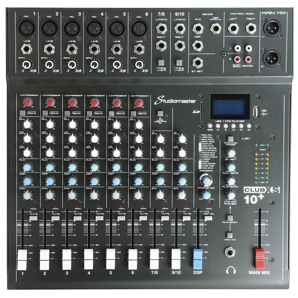 Mixážní pult od firmy Studiomaster z řady CLUB XS+. Tato řada nabízí několik modelů dobře vybavených, odolných, kompaktních a dostupných analogových mixážních pultů. Mixážní pult Studiomaster CLUBXS 10+ s deseti vstupy má vše, co se od mixu podobné kategorie očekává a navíc nabízí i MP3/SD/USB/Bluetooth přehrávání a USB/SD nahrávání, DSP procesor se 16 přednastavenými programy či fantomové napájení mikrofonních vstupů. Má všechny funkce potřebné pro živé míchání nebo nahrávání společenských událostí, performancí sólistů nebo i malých kapel, ať už doma, ve zkušebně nebo na akci.