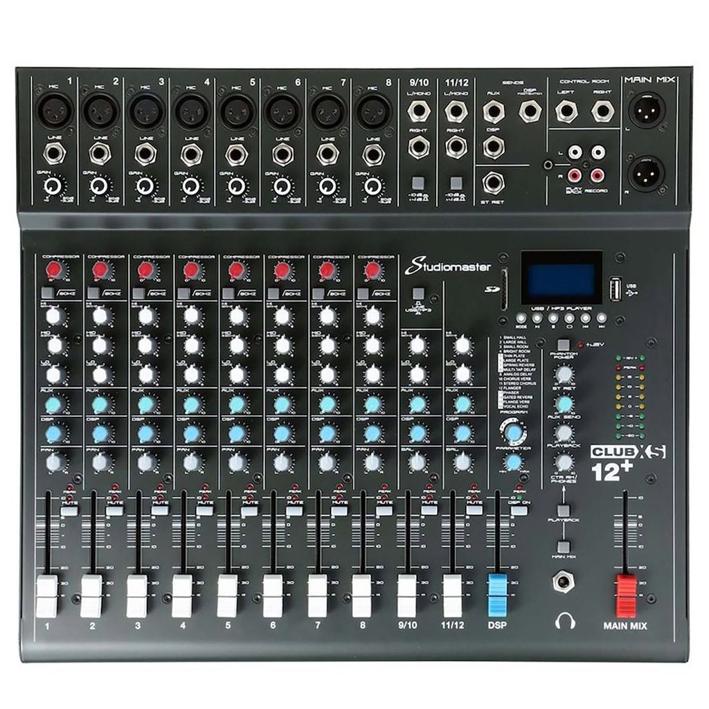 Mixážní pult od firmy Studiomaster z řady CLUB XS+. Tato řada nabízí několik modelů dobře vybavených, odolných, kompaktních a dostupných analogových mixážních pultů. Mixážní pult Studiomaster CLUBXS 12+ s dvanácti vstupy má vše, co se od mixu podobné kategorie očekává a navíc nabízí i MP3/SD/USB/Bluetooth přehrávání a USB/SD nahrávání, DSP procesor se 16 přednastavenými programy či fantomové napájení mikrofonních vstupů. Má všechny funkce potřebné pro živé míchání nebo nahrávání společenských událostí, performancí sólistů nebo i malých kapel, ať už doma, ve zkušebně nebo na akci.