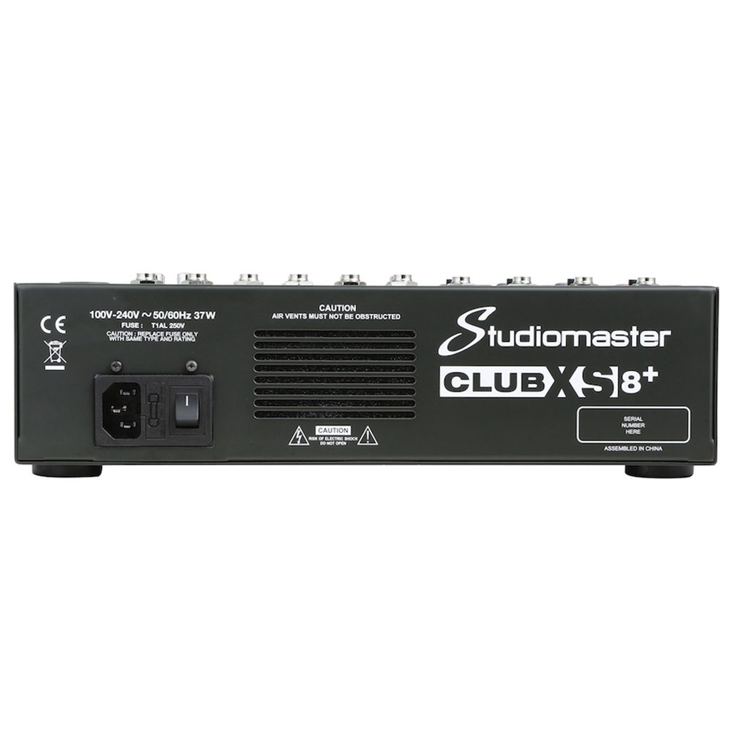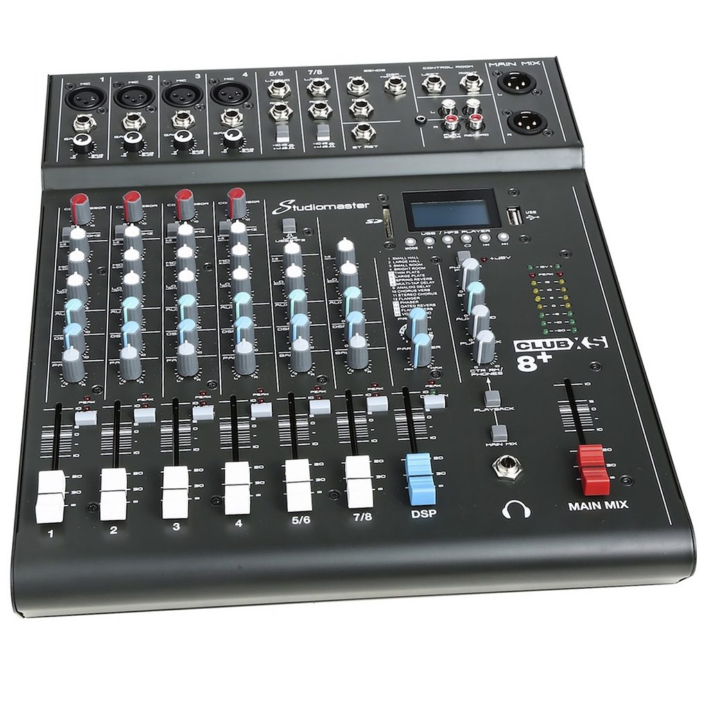 Mixážní pult od firmy Studiomaster z řady CLUB XS+. Tato řada nabízí několik modelů dobře vybavených, odolných, kompaktních a dostupných analogových mixážních pultů. Mixážní pult Studiomaster CLUBXS 8+ s osmi vstupy má vše, co se v této cenové kategorii očekává a navíc nabízí i MP3/SD/USB/Bluetooth přehrávání a USB/SD nahrávání, DSP procesor se 16 přednastavenými programy či fantomové napájení mikrofonních vstupů. Má všechny funkce potřebné pro živé míchání nebo nahrávání společenských událostí, performancí sólistů nebo i malých kapel, ať už doma, ve zkušebně nebo na akci.