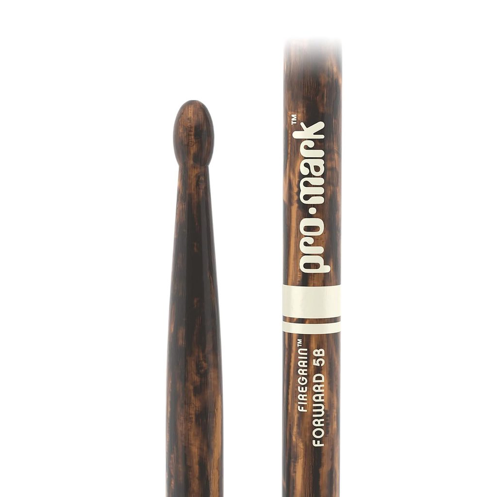 Paličky Pro Mark Classic 5B. Model FireGrain má dřevo se speciální tepelnou úpravou, která zvyšuje pevnost paličky a její odolnost, ale všechny vlastnosti hikorového dřeva přitom zůstávají zachovány. Paličky mají oválnou dřevěnou hlavičku, která jim dává teplý, plný zvuk.
