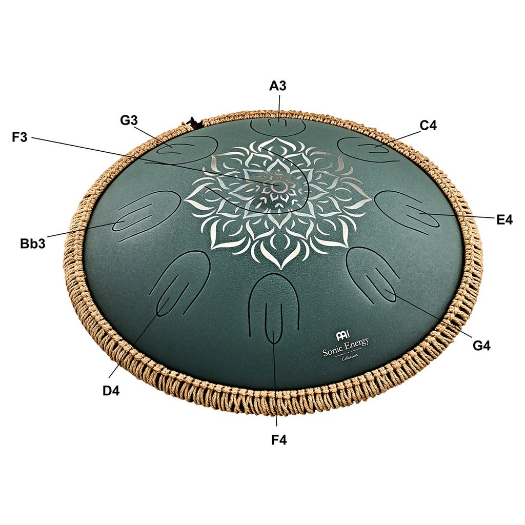 Model Meinl OSTD3DGE je velký 16"/40,6 cm, má 9 tónů v tónině F dur (komorní A = 432 Hz): F3, G3, A3, Bb3, C4, D4, E4, F4, G4. Barva tmavě zelená (Dark Green).