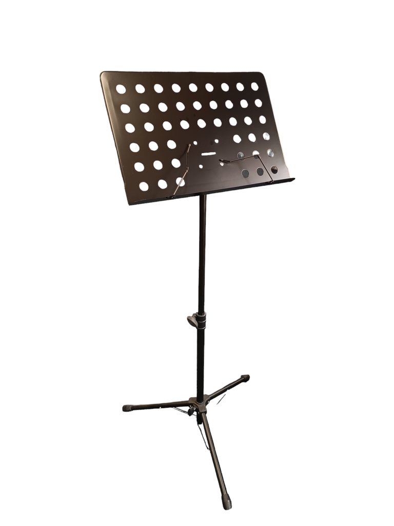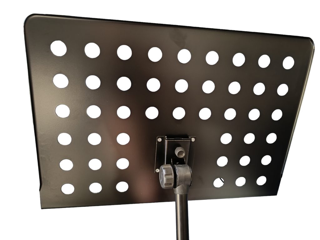 Orchestrální divadelní notový pult, nastavitelná výška stojanu 55-105 cm (rozměr od země ke spodní hraně desky), děrovaná deska 34 x 49 cm, kovový, plastové spoje a mechanických části. Průměr teleskopických trubek nohy stojanu 28,5/22 mm, váha 2 kg - barva černý mat.