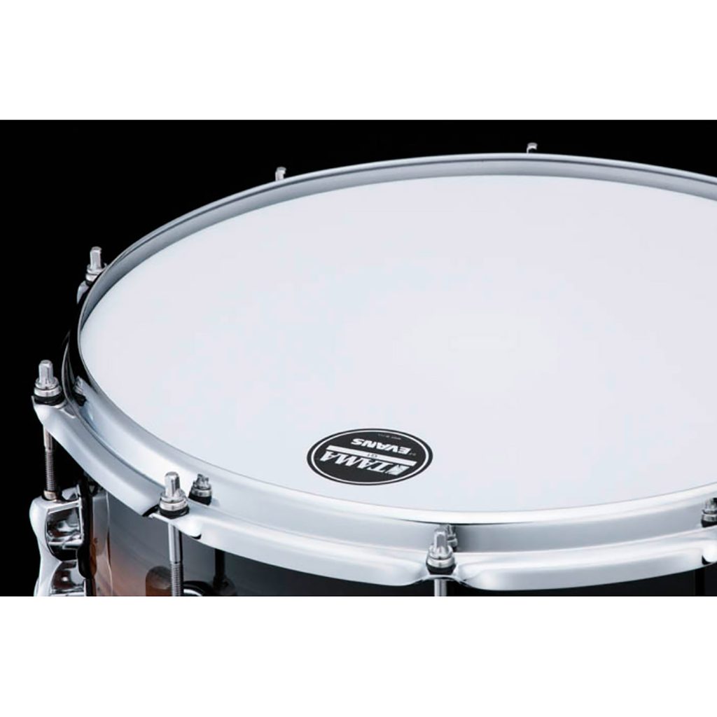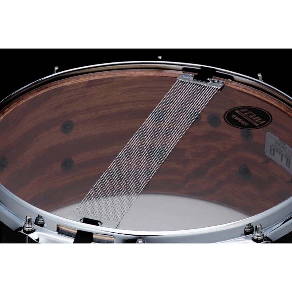 Snare Tama z řady S.L.P., limitovaná edice. 7 mm silný korpus je hybridní a je vyroben ze 6 vrstev bubingy, 2 vrstev javoru a 1 vnější vrstvy z exotického dřeva Zebrawood. Bubinga má hluboký a průrazný zvuk, zatímco javor dává snare vřelost, jasnost artikulační přesnost. Ráfky Tama Sound Arc jsou 2,3 mm silné. Snare je osazen struníkem z vysokouhlíkaté oceli s 20 strunami. Úderová strana je osazena blánou Evans G1 Coated, snare strana pak rezonanční blánou Evans. Povrchová úprava bubínku je lakovaný burst Midnight Zebrawood Burst. Velikost snare je 14" × 6.5".