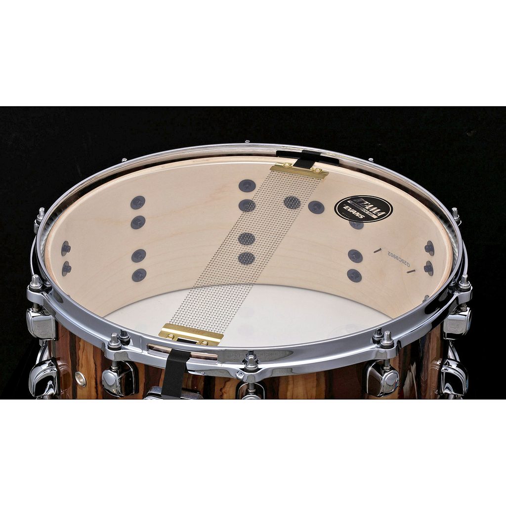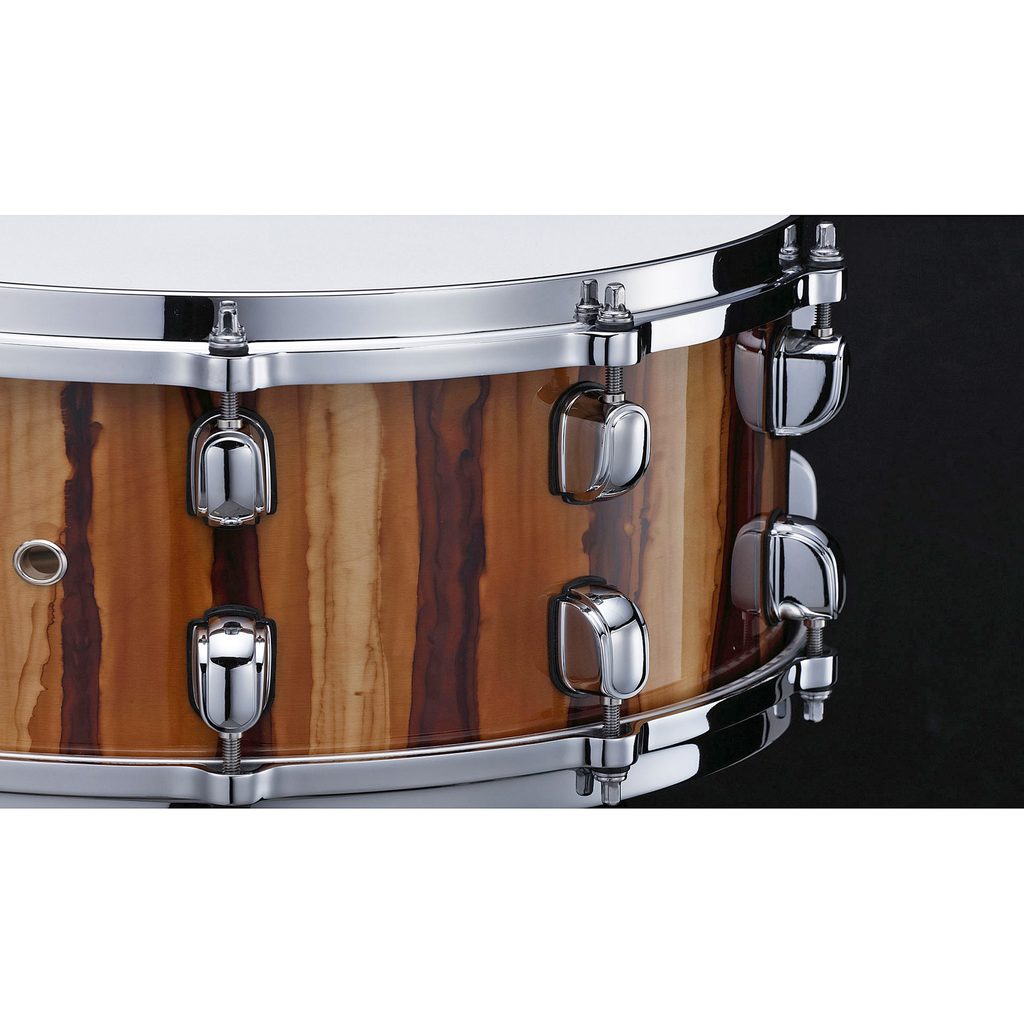 Snare buben Tama z řady Starclassic Performer. Bubny z této řady mají „hybridní“ korpusy: 6 mm silné tělo snare je vyrobeno ze 4 vnějších vrstev břízy a 2 vnitřních vrstev javoru. Buben tak kombinuje hlubší, teplý zvuk javorového dřeva a jasný tón břízy s vysokou projekcí. Hrany korpusů jsou zešikmeny v úhlu 45°. Ráfky jsou lité, hardware je chromovaný. Zvuk snare je čistý, artikulovaný a velmi dobře vyvážený. Lité ráfky mu dodávají jasné, průrazné a plné tóny. Povrchová úprava lesklý lak v hnědé barvě CAR – Caramel Aurora.