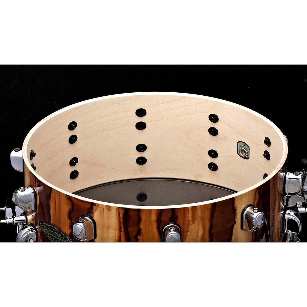 Snare buben Tama z řady Starclassic Performer. Bubny z této řady mají „hybridní“ korpusy: 6 mm silné tělo snare je vyrobeno ze 4 vnějších vrstev břízy a 2 vnitřních vrstev javoru. Buben tak kombinuje hlubší, teplý zvuk javorového dřeva a jasný tón břízy s vysokou projekcí. Hrany korpusů jsou zešikmeny v úhlu 45°. Ráfky jsou lité, hardware je chromovaný. Zvuk snare je čistý, artikulovaný a velmi dobře vyvážený. Lité ráfky mu dodávají jasné, průrazné a plné tóny. Povrchová úprava lesklý lak v MSL – Molten Steel Blue Burst.
