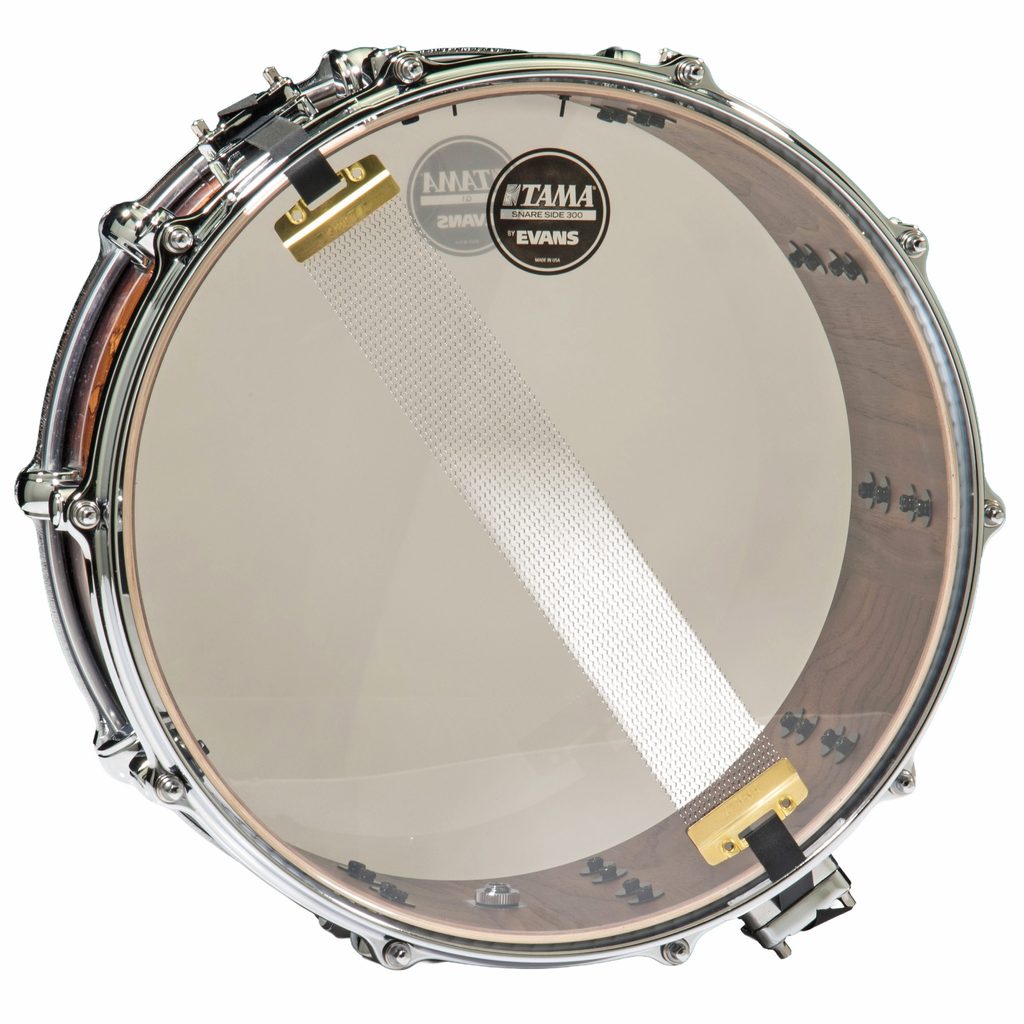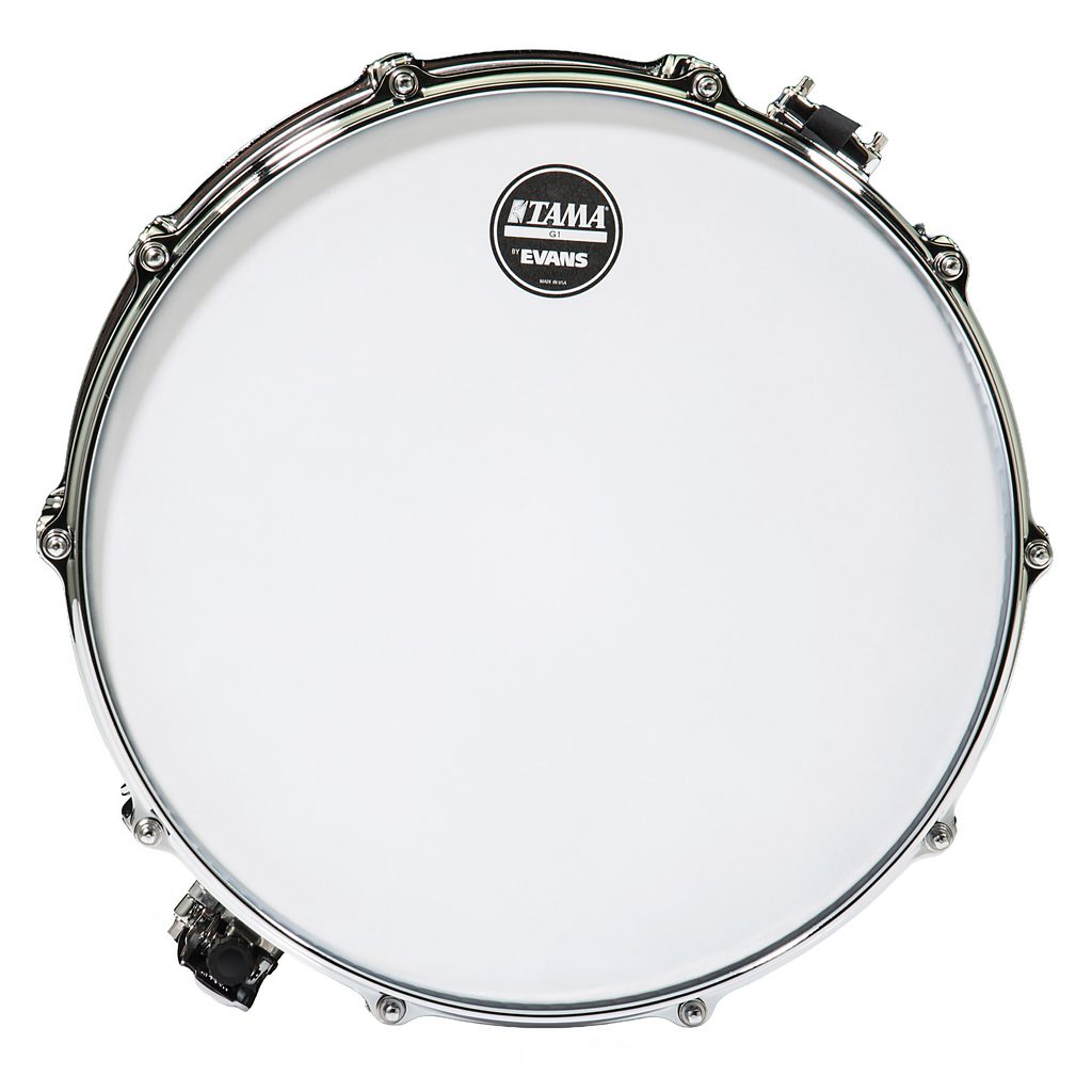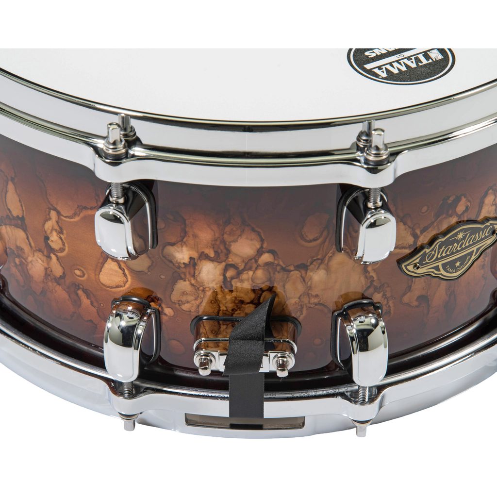 Snare buben Tama z řady Starclassic, 14" × 6,5". Hybridní korpus o celkové tloušťce 6 mm je vyrobený ze 4 vrstev břízy a 2 vrstev černého amerického ořechu. Snare Starclassic Walnut/Birch tak má silný, konkrétní zvuk, který kombinuje jasný atak a projekci břízy s vřelostí středních tónů ořechu. Tento snare má krásnou lakovanou povrchovou úpravu Molten Brown Burst (MBR). Ráfky snare jsou lité, hardware je chromovaný. Buben je osazen blánami Evans G1.