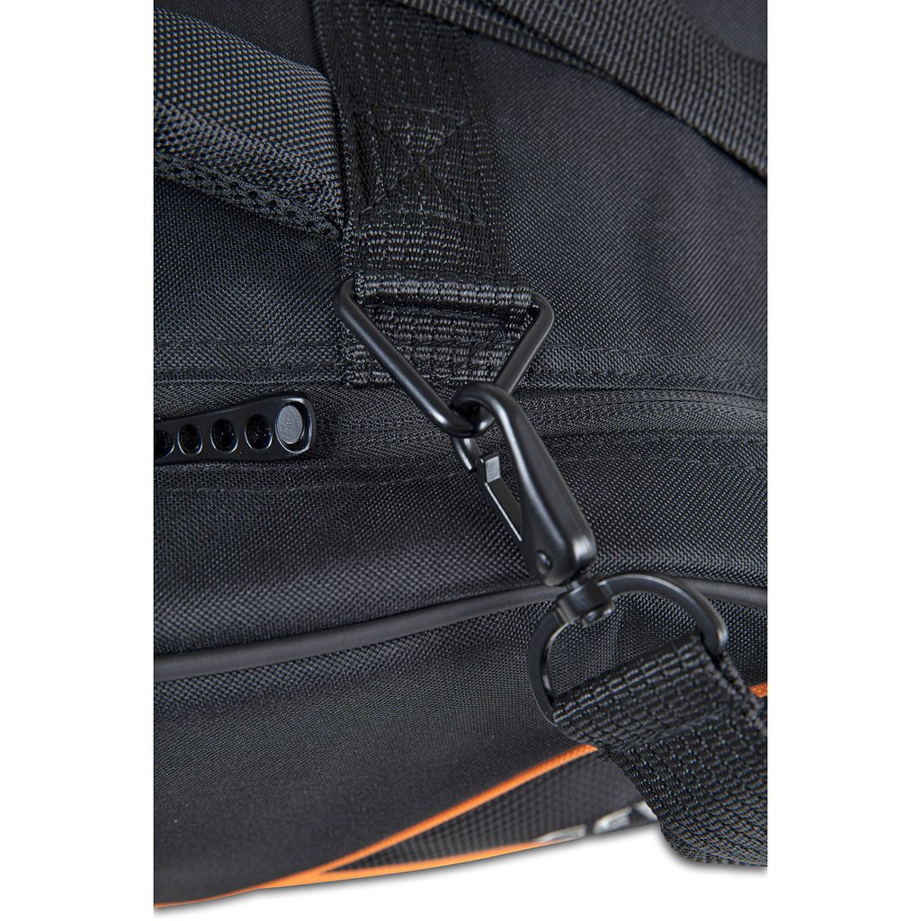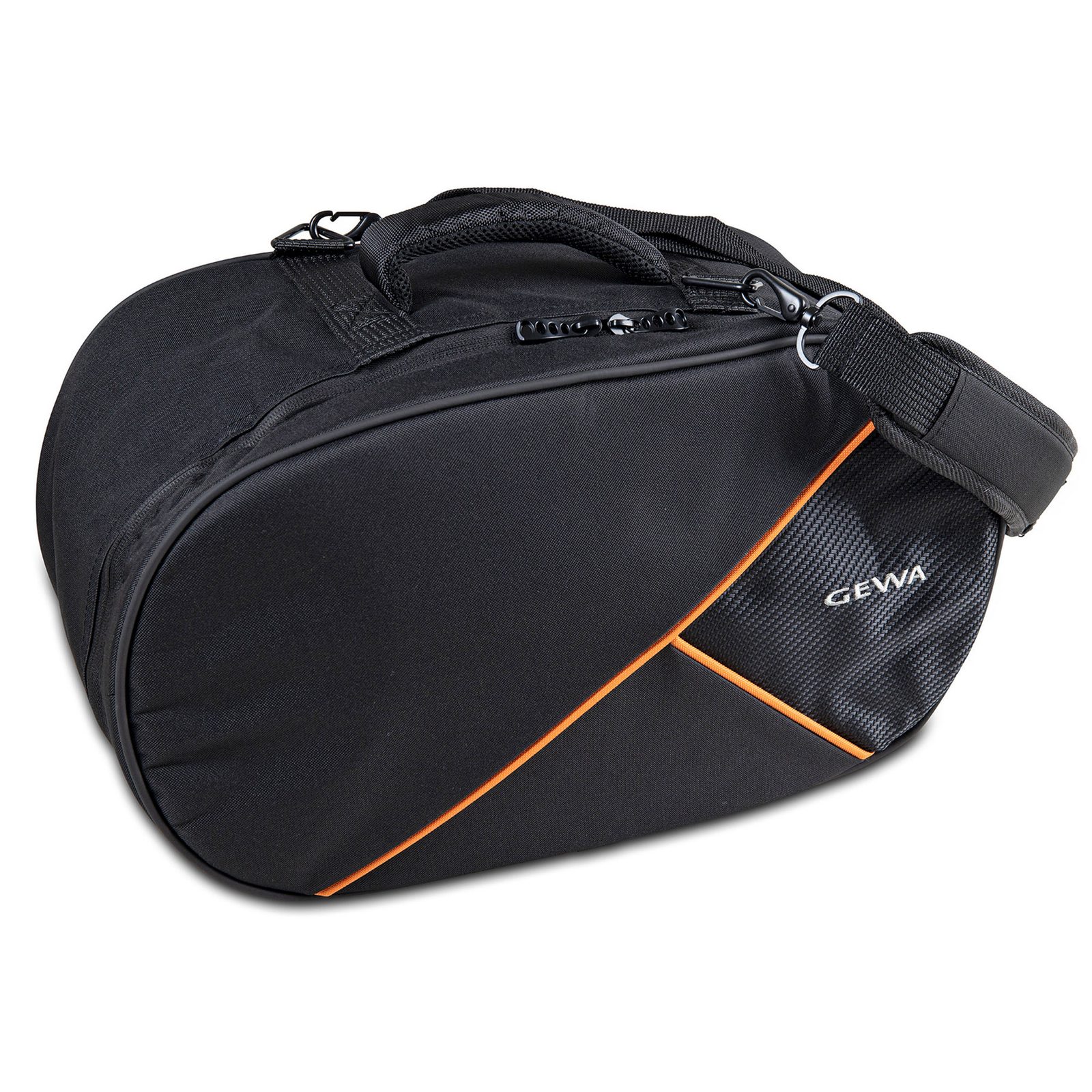 Prémiový obal GEWA s polstrováním pro bongo s rozměrem 48 × 26 × 21 cm. Je vyroben z pevného černého nylonu Condura 600 Denier, který je dobře odolný proti vodě i mechanickému poškození. Obal se vyznačuje vysokou kvalitou zpracování, všechna namáhaná místa jsou zpevněna a zesílena. Karabiny a očka jsou kovové, zipy jsou velmi robustní, s dlouhou životností, a spodní strana obalu je vyztužena pogumovanou podložkou. Váš nástroj je proti poškození chráněn 20 mm silným polstrováním a sametovou podšívkou uvnitř obalu. Obal má pevné ucho a ramenní popruh s polstrovaným podložením pro snadný transport. Barva obalu je černá, přední strana je zdobena logem GEWA a oranžovými proužky.