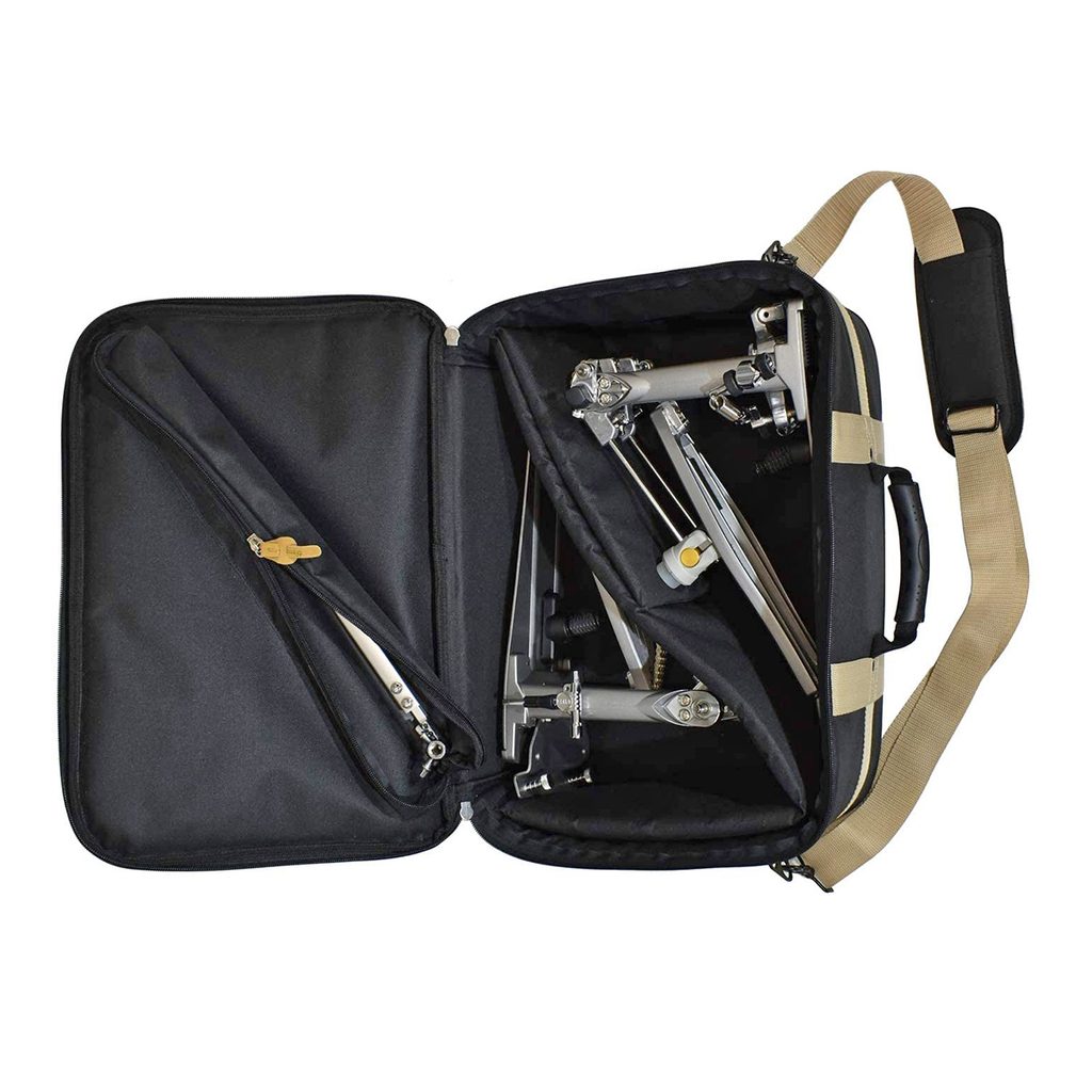 Designová taška na pedál Tama z řady Powerpad. Jde o kompaktní a stylovou tašku, která je určena pro transport vašeho jednoduchého nebo dvojitého pedálu. Uvnitř je vyndávací přepážka, která umožňuje v tašce nosit další drobné vybavení, pokud ji využíváte pouze pro jednoduchý pedál. Je vyrobena z odolného nylonu, který ochrání pedál proti poškození při přepravě. Je vybavena vyztuženým uchem a popruhem přes ramena. Boční kapsa pro dokumenty nebo drobné příslušenství.