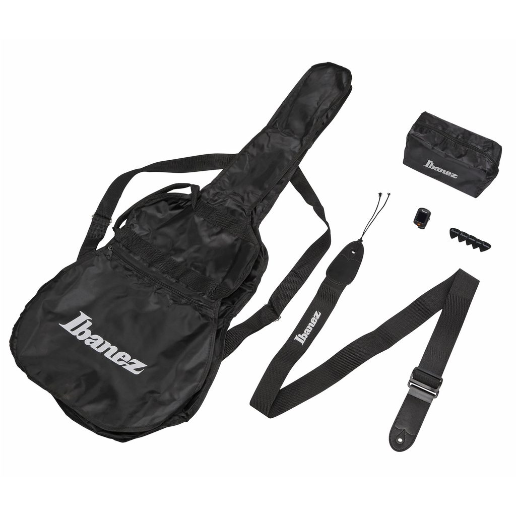 Kytarový pack Ibanez „vše v jednom“, určený zejména pro začátečníky ve hře na akustickou kytaru. Obsahuje vše, co začátečník potřebuje, stačí vybalit a hrát. Základem packu je akustická kytara Ibanez z řady V s tělem typu dreadnought. Dále pak pack obsahuje kytarový obal, klipovou ladičku, kytarový popruh, tašku na příslušenství a trsátka.