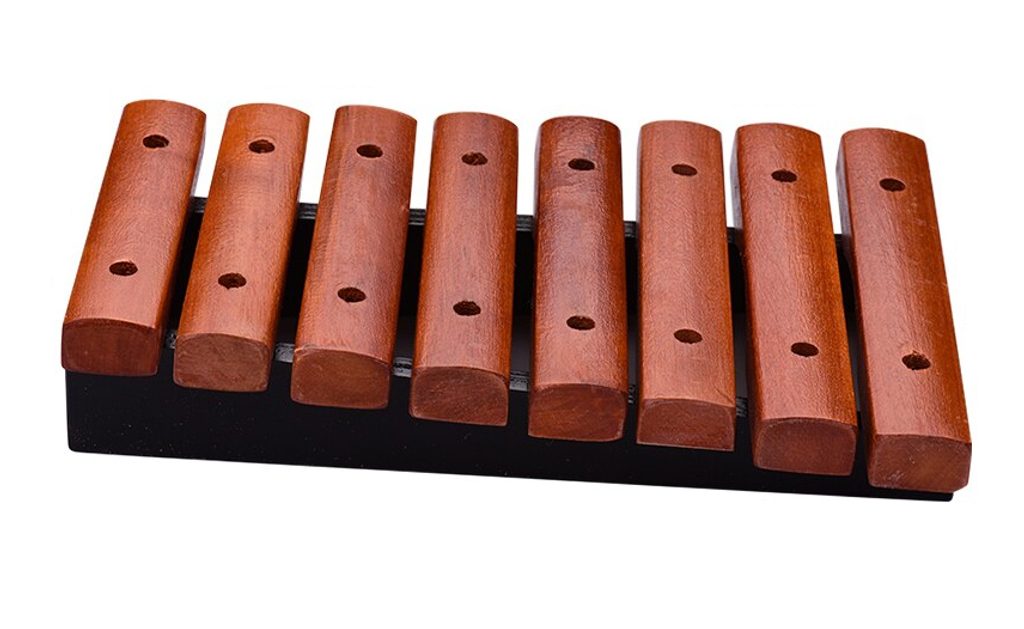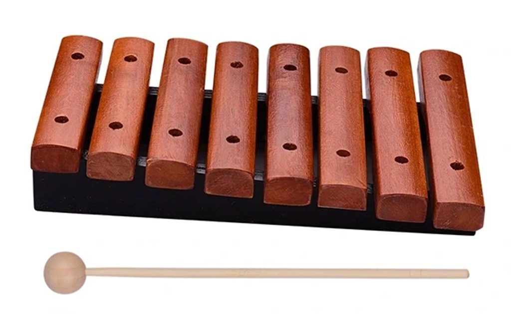 Dětský xylofon, dřevěný rám a osm dřevěných hracích kamenů s jednou dřevěnou paličkou. Velikost přibližně 25 x 19 x 2,5 cm.