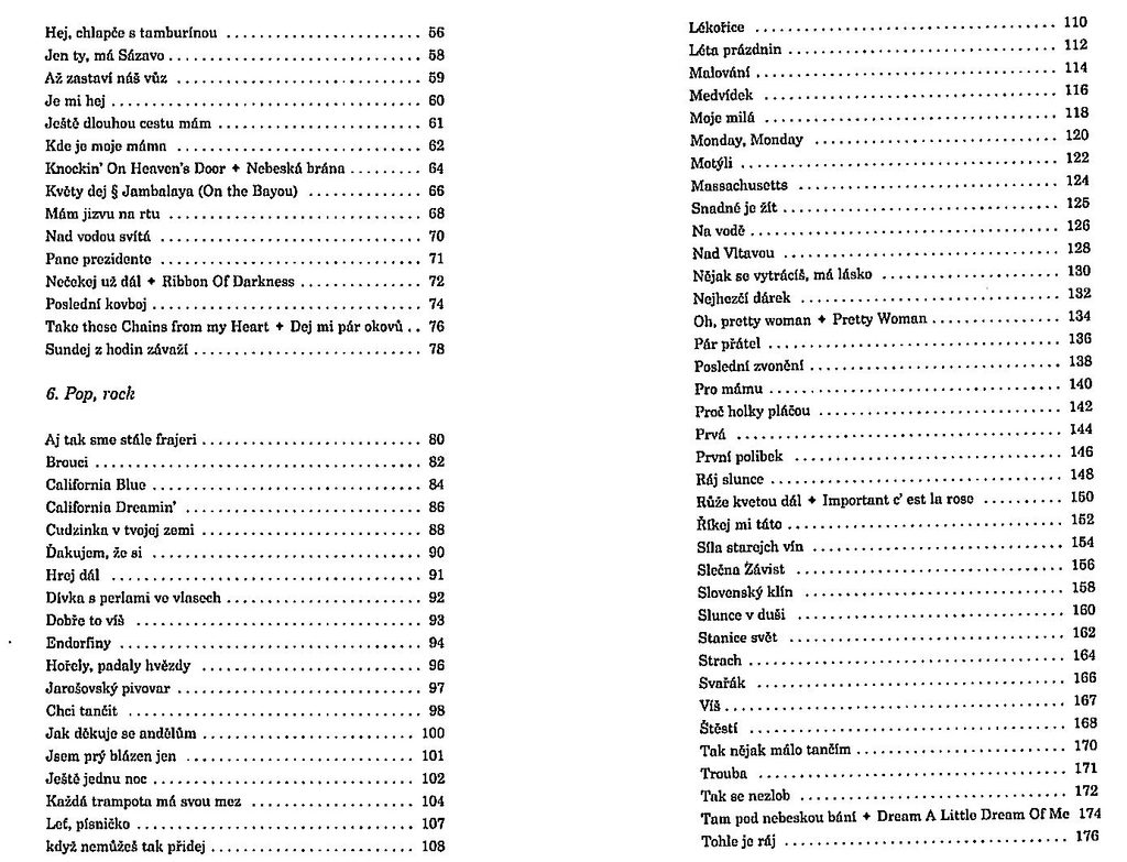Já & písnička 6 je již šestým pokračováním velmi oblíbeného zpěvníku, který obsahuje 146 nejen našich, ale i zahraničních lidových písní a moderních i klasických skladeb rocku, popu, country, muzikálů a dalších žánrů. Písně obsahují české nebo anglické texty. Počet skladeb 146, formát A5, vázané.